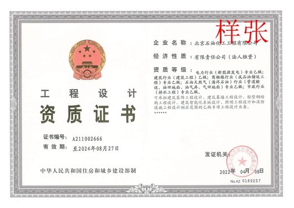 電力行業(yè)(新能源發(fā)電)專業(yè)乙級;建筑行業(yè)(建筑工程)乙級;商務(wù)糧行業(yè)(成品油儲運工程)專業(yè)乙級;石油天然氣(海洋石油)行業(yè)(管道輸送、油田地面、油氣庫)專業(yè)乙級;市政行業(yè)(排水工程)專業(yè)乙級。