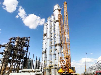 按工藝需要,乙醇裝置共設(shè)置12臺塔器,二甲醚單元3臺,羰基化單元1臺,加熱爐單元1臺,加氫及產(chǎn)品分離單元7臺。目前累計完成塔器吊裝就位9臺,剩余塔器預(yù)計8月底前全部安裝就位。