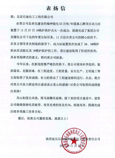 【表?yè)P(yáng)信】祝賀榆神能化煤基乙醇項(xiàng)目1號(hào)鍋爐低溫烘爐點(diǎn)火一次成功