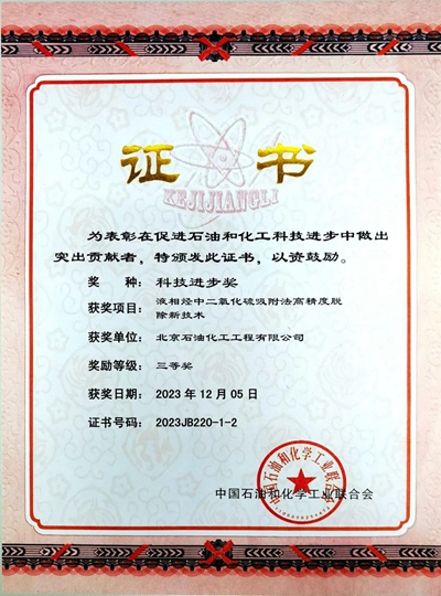近日,中國(guó)石油和化學(xué)工業(yè)聯(lián)合會(huì)公示了《2023年度科學(xué)技術(shù)獎(jiǎng)》獲獎(jiǎng)成果,北京石油化工工程有限公司“液相烴中二氧化硫吸附法高精度脫除新技術(shù)”榮獲2023年度中國(guó)石油和化學(xué)工業(yè)聯(lián)合會(huì)科技進(jìn)步獎(jiǎng)三等獎(jiǎng)。