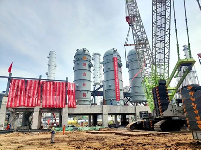 此次吊裝的3臺反應器包括1臺乙酸甲酯加氫反應器和2臺羰基化反應器,均為乙醇裝置的核心設備。其中,羰基化反應器直徑達5.4米,高度近21米,設備質量604噸,是本項目最重且吊裝難度最大的設備。