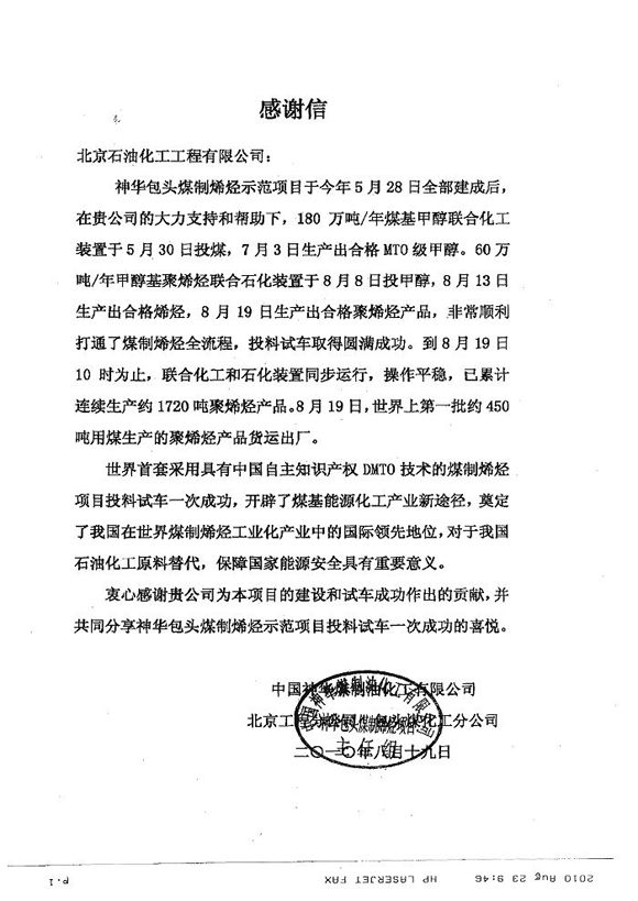 中國神華煤制油化工有限公司發(fā)來感謝信