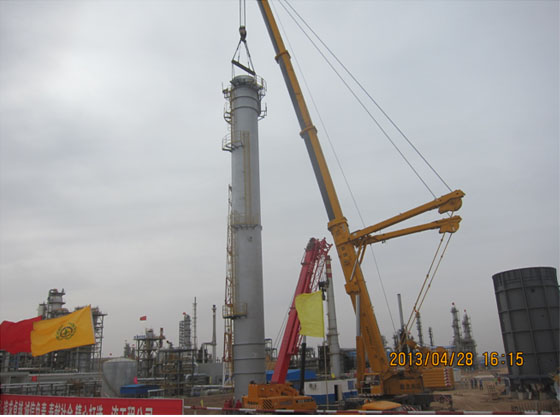 2013年4月28日早晨,隨著吊車發(fā)動(dòng)機(jī)隆隆的聲響,100項(xiàng)目(煤-油共煉試驗(yàn)示范項(xiàng)目)現(xiàn)場(chǎng)第一吊--煙囪吊裝開始作業(yè),這標(biāo)志著100項(xiàng)目進(jìn)入了設(shè)備安裝階段。
