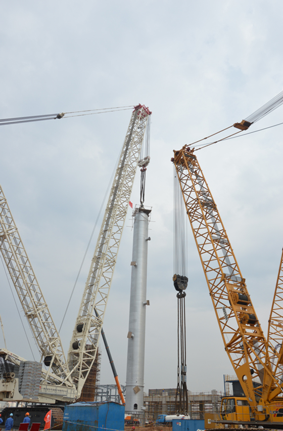 這次吊裝的加氫裂化固定床反應(yīng)器重量為617噸,高度為43米,直徑為3.2米,吊裝總重為668噸。由陜化建吊運(yùn)公司進(jìn)行吊裝,主吊為1250噸履帶吊,遛尾吊車為450噸履帶吊,吊運(yùn)公司設(shè)備先進(jìn)、技術(shù)精湛、措施到位,也是這次吊裝成功的關(guān)鍵條件。