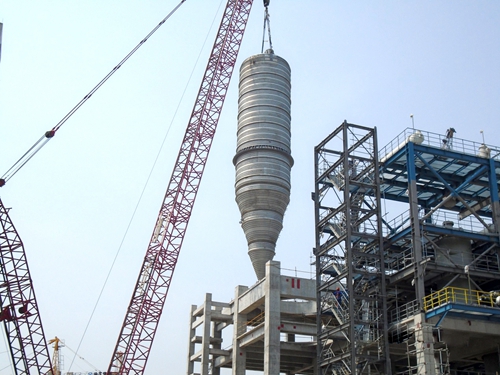 近日, 北京工程公司延能化項目45萬噸/年高密度聚乙烯(HDPE)裝置聚合單元超限設(shè)備粉料處理罐(D-2301)吊裝就位。