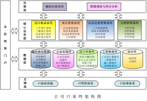 公司建立起以設(shè)計集成系統(tǒng)、項目管理系統(tǒng)、OA及運營管理系統(tǒng)、全面預(yù)算系統(tǒng)和文檔管理系統(tǒng)為主體的核心業(yè)務(wù)層系統(tǒng),對工程設(shè)計、工程項目管理、公司運營管理的日常工作起到支撐作用。